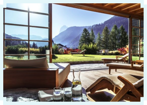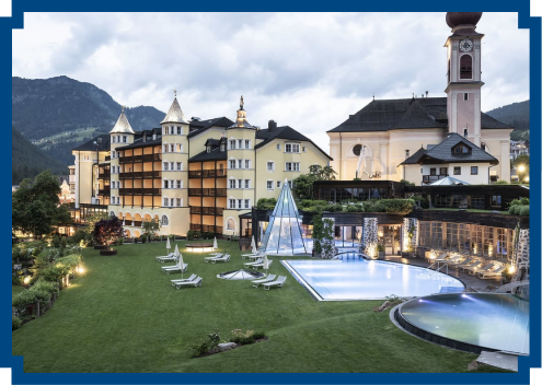 Montanhas, neve, e ar puro esperam por você nos 9,000 m² de bosque do hotel. O Adler Spa Resort promete muito conforto e momentos únicos em nossa viagem aos Alpes di Siusi!